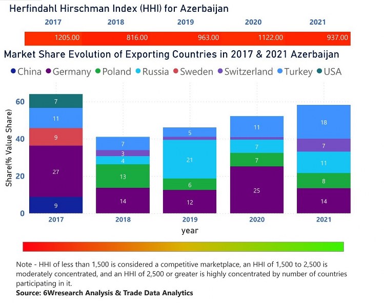 In the year 2021, Turkey was the largest exporter in terms of value, followed by Germany. It has registered a growth of 66.78% over the previous year. While Germany registered a decline of -43.46% as compare to the previous year. In the year 2017 Germany was the largest exporter followed by Turkey. In term of Herfindahl Index, which measures the competitiveness of countries exporting, Azerbaijan has the Herfindahl index of 1205 in 2017 which signifies high competitiveness also in 2021 it registered a Herfindahl index of 937 which signifies high competitiveness in the market.