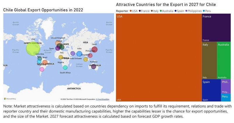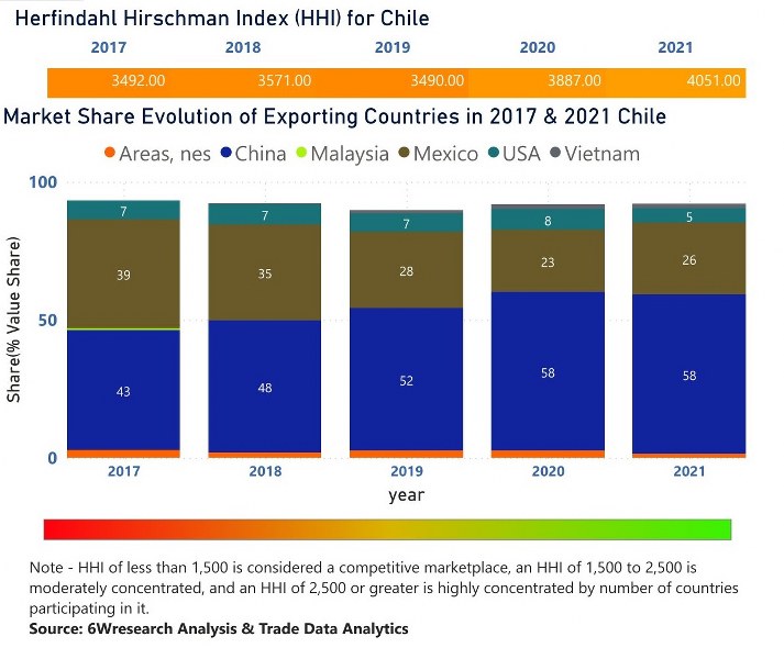 In the year 2021, China was the largest exporter in terms of value, followed by Mexico. It has registered a growth of 67.3% over the previous year. While Mexico registered a growth of 92.22% as compare to the previous year. In the year 2017 China was the largest exporter followed by Mexico. In term of Herfindahl Index, which measures the competitiveness of countries exporting, Chile has the Herfindahl index of 3492 in 2017 which signifies high concentration also in 2021 it registered a Herfindahl index of 4051 which signifies high concentration in the market.