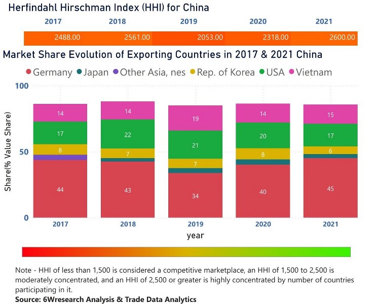 In the year 2021, Germany was the largest exporter in terms of value, followed by USA. It has registered a growth of 22.17% over the previous year. While USA registered a decline of -5.13% as compare to the previous year. In the year 2017 Germany was the largest exporter followed by USA. In term of Herfindahl Index, which measures the competitiveness of countries exporting, China has the Herfindahl index of 2488 in 2017 which signifies moderately concentrated also in 2021 it registered a Herfindahl index of 2600 which signifies high concentration in the market.