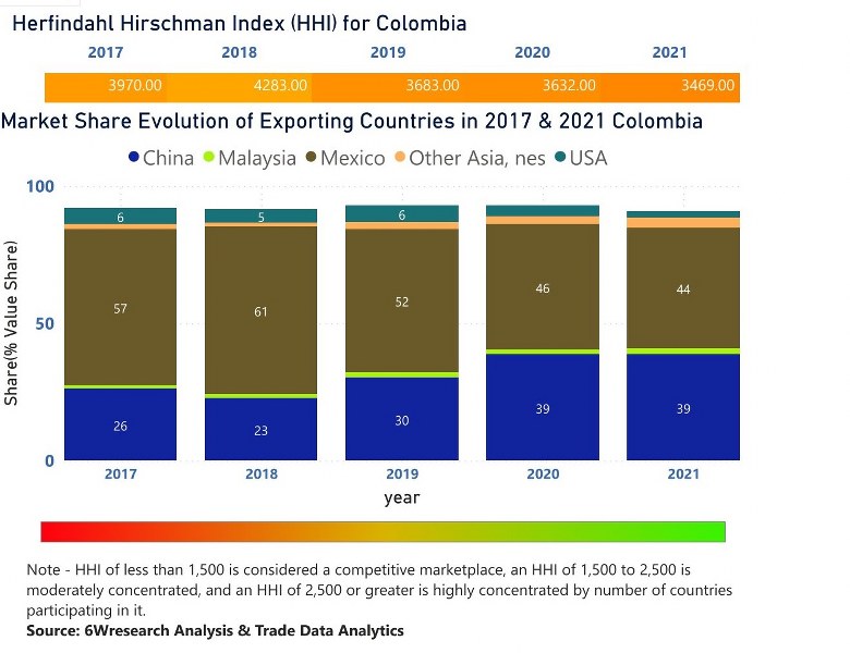 In the year 2021, Mexico was the largest exporter in terms of value, followed by China. It has registered a growth of 9.71% over the previous year. While China registered a growth of 14.72% as compare to the previous year. In the year 2017 Mexico was the largest exporter followed by China. In term of Herfindahl Index, which measures the competitiveness of countries exporting, Colombia has the Herfindahl index of 3970 in 2017 which signifies high concentration also in 2021 it registered a Herfindahl index of 3469 which signifies high concentration in the market.