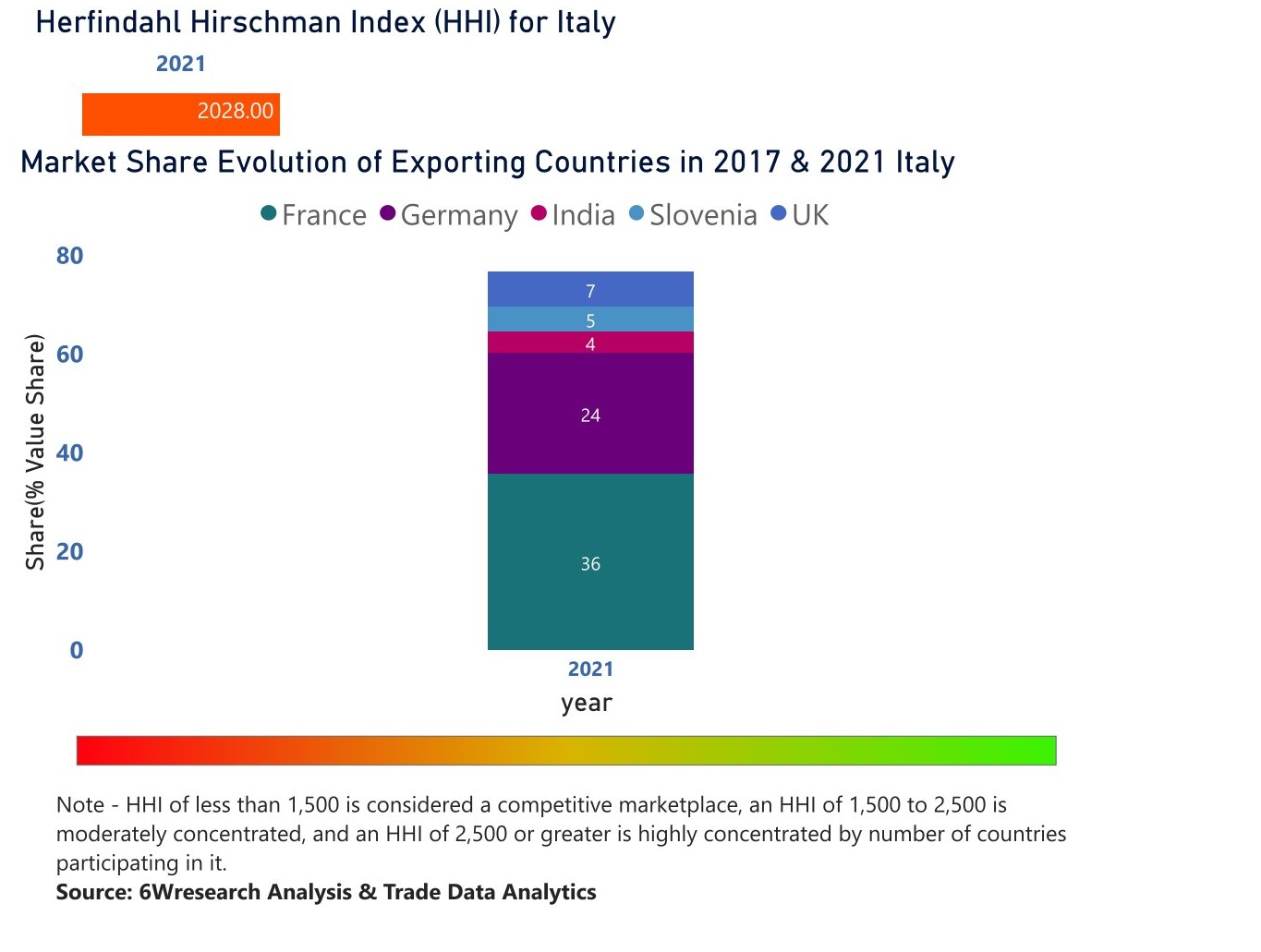 In the year 2021, France was the largest exporter in terms of value, followed by Germany. It has registered a growth of 27.32% over the previous year. While Germany registered a growth of 780.08% as compare to the previous year. In the year 2017 France was the largest exporter followed by Netherlands. In term of Herfindahl Index, which measures the competitiveness of countries exporting, Italy has the Herfindahl index of 2340 in 2017 which signifies moderately concentrated also in 2021 it registered a Herfindahl index of 2028 which signifies moderately concentrated in the market.