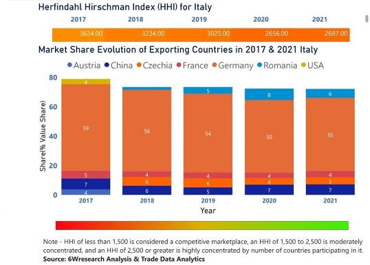 In the year 2021, Germany was the largest exporter in terms of value, followed by China. It has registered a growth of 36.91% over the previous year. While China registered a growth of 39.42% as compare to the previous year. In the year 2017 Germany was the largest exporter followed by China. In term of Herfindahl Index, which measures the competitiveness of countries exporting, Italy has the Herfindahl index of 3624 in 2017 which signifies high concentration also in 2021 it registered a Herfindahl index of 2687 which signifies high concentration in the market.