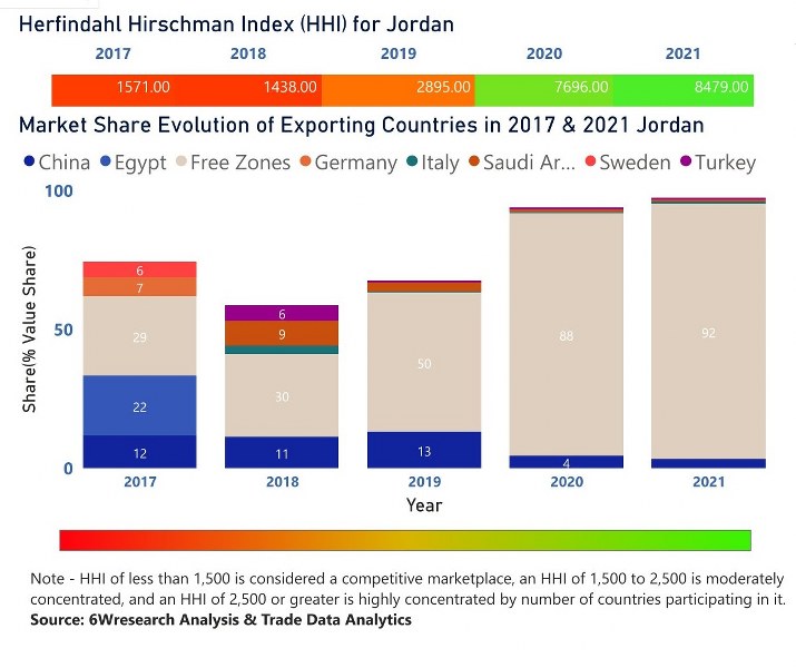 In the year 2021, Free Zones was the largest exporter in terms of value, followed by China. It has registered a decline of -1.42% over the previous year. While China registered a decline of -31.99% as compare to the previous year. In the year 2017 Free Zones was the largest exporter followed by Egypt. In term of Herfindahl Index, which measures the competitiveness of countries exporting, Jordan has the Herfindahl index of 1571 in 2017 which signifies moderately concentrated also in 2021 it registered a Herfindahl index of 8479 which signifies high concentration in the market.