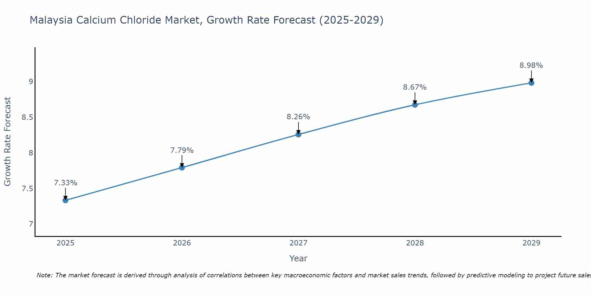 The Malaysia Calcium Chloride Market is likely to experience consistent growth rate gains over the period 2025 to 2029. The growth rate starts at 7.33% in 2025 and reaches 8.98% by 2029.