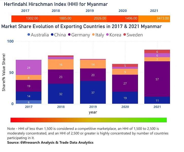 In the year 2021, Germany was the largest exporter in terms of value, followed by China. It has registered a decline of -9.39% over the previous year. While China registered a decline of -74.58% as compare to the previous year. In the year 2017 Rep. of Korea was the largest exporter followed by Germany. In term of Herfindahl Index, which measures the competitiveness of countries exporting, Myanmar has the Herfindahl index of 1302 in 2017 which signifies high competitiveness also in 2021 it registered a Herfindahl index of 3473 which signifies high concentration in the market.