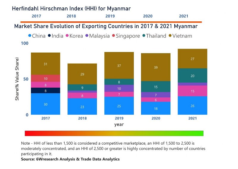 In the year 2021, Viet Nam was the largest exporter in terms of value, followed by China. It has registered a decline of -55.09% over the previous year. While China registered a decline of -8.4% as compare to the previous year. In the year 2017 Viet Nam was the largest exporter followed by China. In term of Herfindahl Index, which measures the competitiveness of countries exporting, Myanmar has the Herfindahl index of 2132 in 2017 which signifies moderately concentrated also in 2021 it registered a Herfindahl index of 2072 which signifies moderately concentrated in the market.