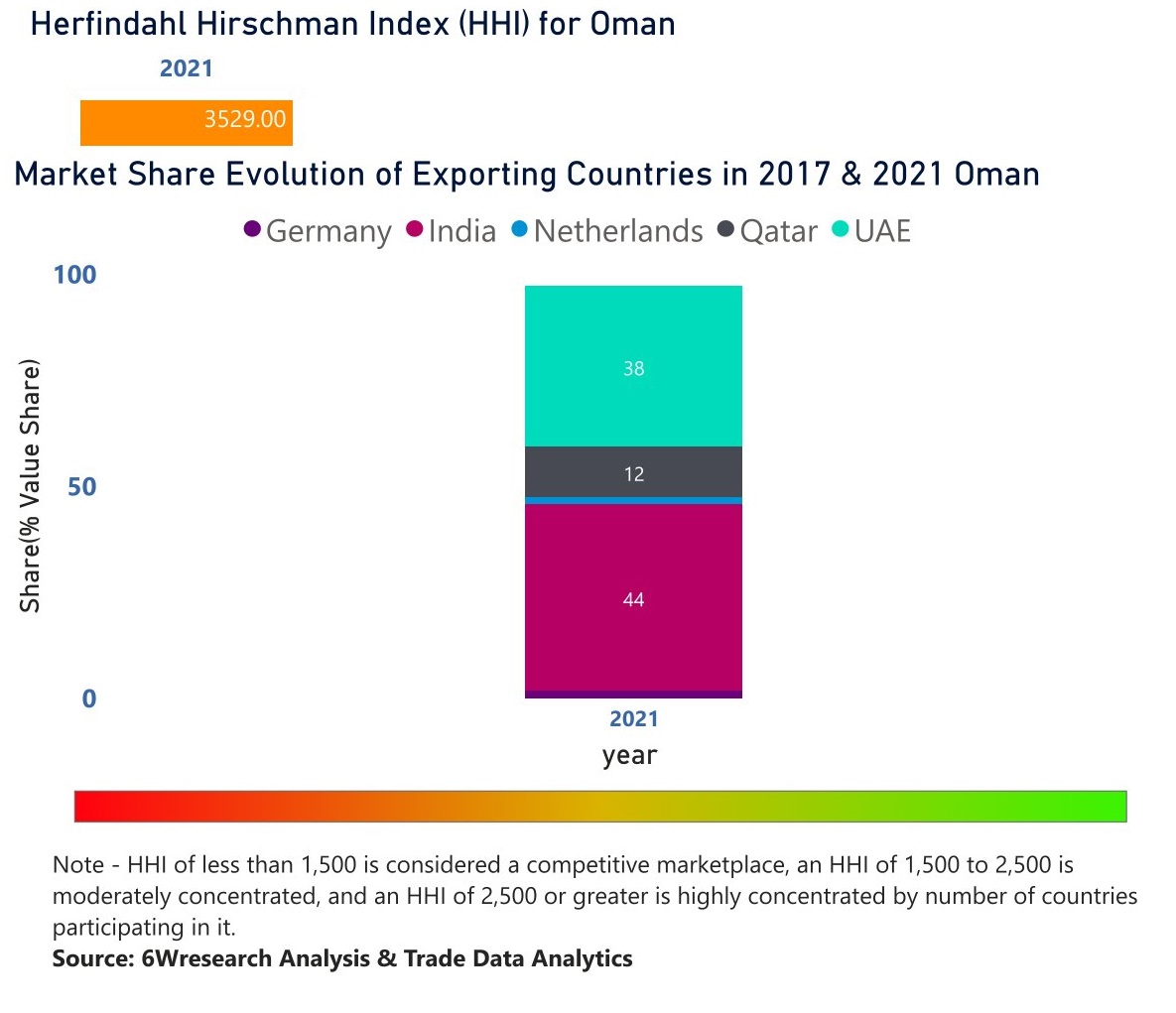 In the year 2021, India was the largest exporter in terms of value, followed by UAE. It has registered a decline of -41.61% over the previous year. While UAE registered a decline of -35.39% as compare to the previous year. In the year 2017 UAE was the largest exporter followed by India. In term of Herfindahl Index, which measures the competitiveness of countries exporting, Oman has the Herfindahl index of 2092 in 2017 which signifies moderately concentrated also in 2021 it registered a Herfindahl index of 3529 which signifies high concentration in the market.