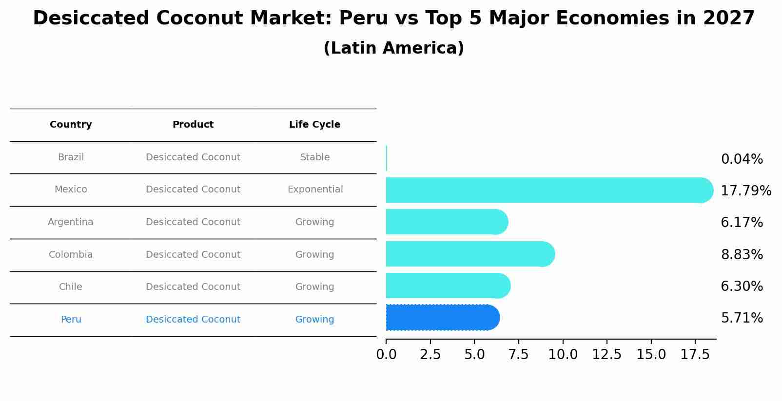 In the Latin America region, the Desiccated Coconut market in Peru is projected to expand at a growing growth rate of 5.71% by 2027. The largest economy is Brazil, followed by Mexico, Argentina, Colombia and Chile.