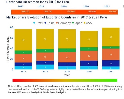 In the year 2021, USA was the largest exporter in terms of value, followed by Germany. It has registered a growth of 39.53% over the previous year. While Germany registered a growth of 41.88% as compare to the previous year. In the year 2017 USA was the largest exporter followed by Germany. In term of Herfindahl Index, which measures the competitiveness of countries exporting, Peru has the Herfindahl index of 2084 in 2017 which signifies moderately concentrated also in 2021 it registered a Herfindahl index of 1968 which signifies moderately concentrated in the market.