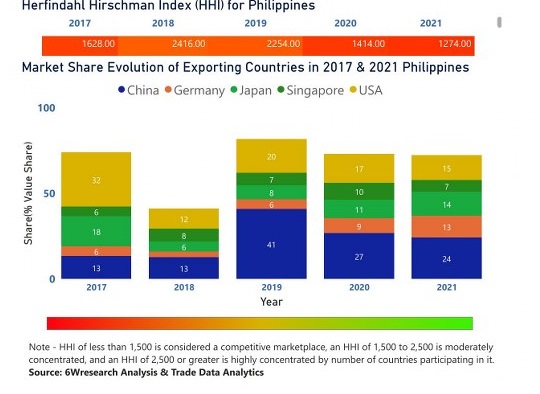 In the year 2021, China was the largest exporter in terms of value, followed by the USA. It has registered a growth of 0.32% over the previous year. While the USA registered a decline of -4.47% as compared to the previous year. In the year 2017, the USA was the largest exporter followed by Japan. In terms of the Herfindahl Index, which measures the competitiveness of countries exporting, the Philippines has a Herfindahl index of 1628 in 2017 which signifies moderately concentrated also in 2021 it registered a Herfindahl index of 1274 which signifies high competitiveness in the market.