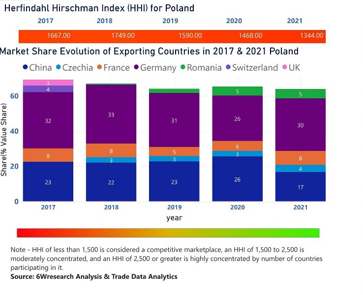 In the year 2021, Germany was the largest exporter in terms of value, followed by China. It has registered a growth of 25.79% over the previous year. While China registered a decline of -28.47% as compare to the previous year. In the year 2017 Germany was the largest exporter followed by China. In term of Herfindahl Index, which measures the competitiveness of countries exporting, Poland has the Herfindahl index of 1667 in 2017 which signifies moderately concentrated also in 2021 it registered a Herfindahl index of 1344 which signifies high competitiveness in the market.