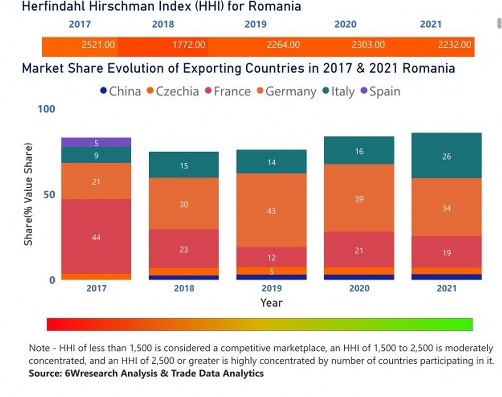 In the year 2021, Germany was the largest exporter in terms of value, followed by Italy. It has registered a decline of -3.9% over the previous year. While Italy registered a growth of 81.77% as compare to the previous year. In the year 2017 France was the largest exporter followed by Germany. In term of Herfindahl Index, which measures the competitiveness of countries exporting, Romania has the Herfindahl index of 2521 in 2017 which signifies high concentration also in 2021 it registered a Herfindahl index of 2232 which signifies moderately concentrated in the market.