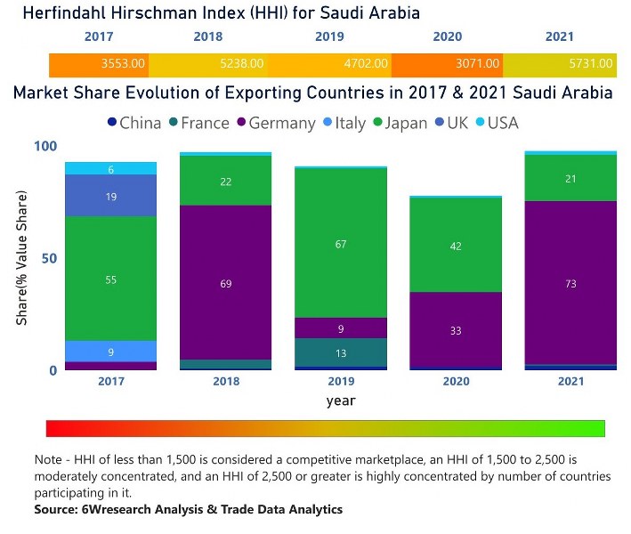 In the year 2021, Germany was the largest exporter in terms of value, followed by Japan. It has registered a growth of 92.8% over the previous year. While Japan registered a decline of -56.78% as compare to the previous year. In the year 2017 Japan was the largest exporter followed by UK. In term of Herfindahl Index, which measures the competitiveness of countries exporting, Saudi Arabia has the Herfindahl index of 3553 in 2017 which signifies high concentration also in 2021 it registered a Herfindahl index of 5731 which signifies high concentration in the market.