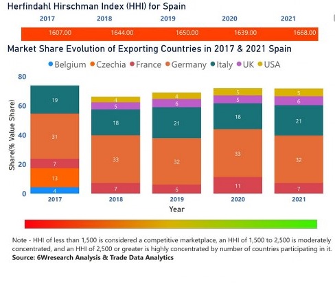 In the year 2021, Germany was the largest exporter in terms of value, followed by Italy. It has registered a growth of 20.03% over the previous year. While Italy registered a growth of 41.38% as compare to the previous year. In the year 2017 Germany was the largest exporter followed by Italy. In term of Herfindahl Index, which measures the competitiveness of countries exporting, Spain has the Herfindahl index of 1607 in 2017 which signifies moderately concentrated also in 2021 it registered a Herfindahl index of 1668 which signifies moderately concentrated in the market.