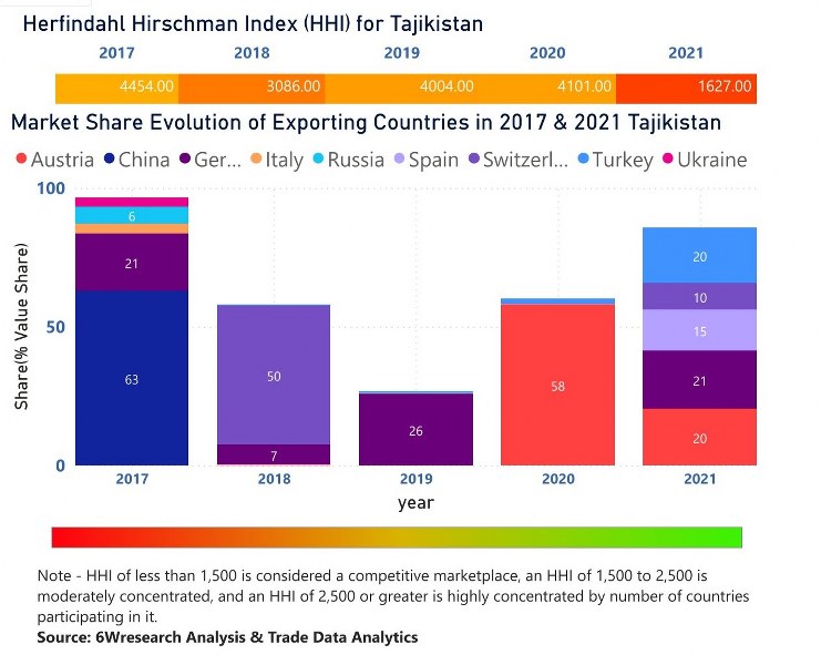 In the year 2021, Germany was the largest exporter in terms of value, followed by Austria. It has registered a growth of 87717.87% over the previous year. While Austria registered a growth of 69.15% as compare to the previous year. In the year 2017 China was the largest exporter followed by Germany. In term of Herfindahl Index, which measures the competitiveness of countries exporting, Tajikistan has the Herfindahl index of 4454 in 2017 which signifies high concentration also in 2021 it registered a Herfindahl index of 1627 which signifies moderately concentrated in the market.