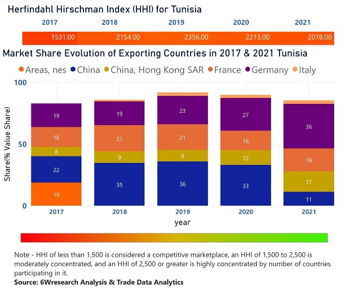 In the year 2021, Germany was the largest exporter in terms of value, followed by France. It has registered a growth of 9.23% over the previous year. While France registered a decline of -5.81% as compare to the previous year. In the year 2017 China was the largest exporter followed by Germany. In term of Herfindahl Index, which measures the competitiveness of countries exporting, Tunisia has the Herfindahl index of 1531 in 2017 which signifies moderately concentrated also in 2021 it registered a Herfindahl index of 2078 which signifies moderately concentrated in the market.