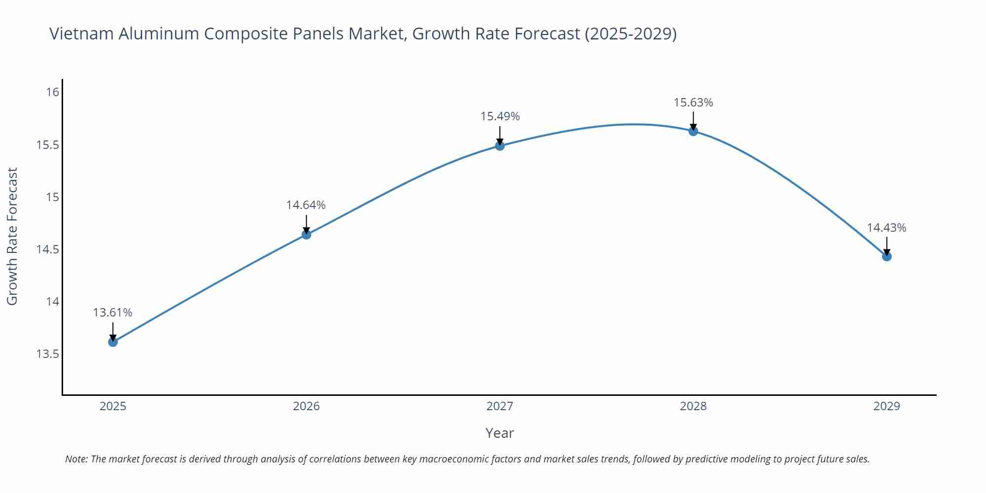 The Vietnam Aluminum Composite Panels Market is projected to witness mixed growth rate patterns during 2025 to 2029. Growth accelerates to 15.63% in 2028, following an initial rate of 13.61%, before easing to 14.43% at the end of the period.