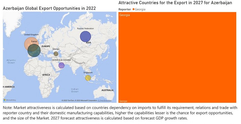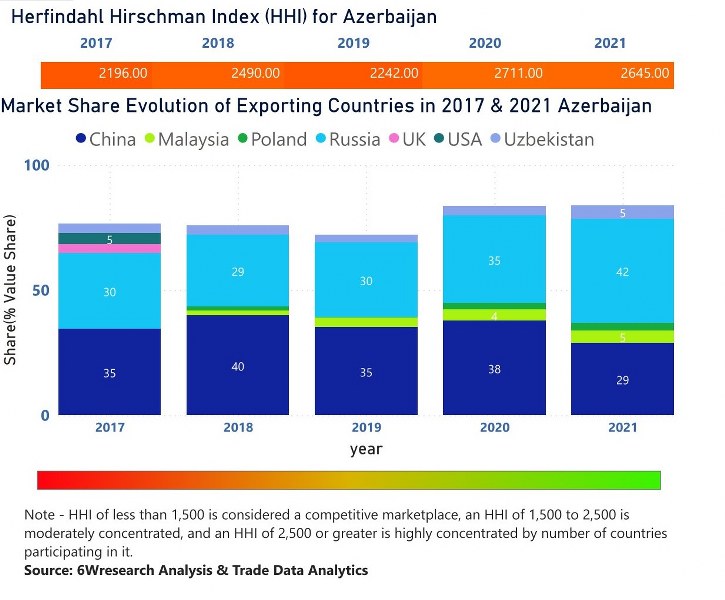 In the year 2021, Russia was the largest exporter in terms of value, followed by China. It has registered a growth of 15.19% over the previous year. While China registered a decline of -25.59% as compare to the previous year. In the year 2017 China was the largest exporter followed by Russia. In term of Herfindahl Index, which measures the competitiveness of countries exporting, Azerbaijan has the Herfindahl index of 2196 in 2017 which signifies moderately concentrated also in 2021 it registered a Herfindahl index of 2645 which signifies high concentration in the market.