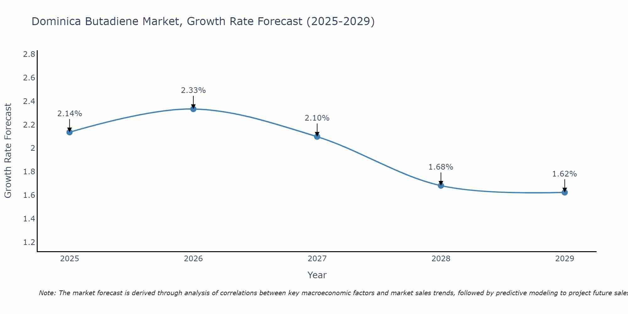 The Dominica Butadiene Market is projected to witness mixed growth rate patterns during 2025 to 2029. The growth rate begins at 2.14% in 2025, climbs to a high of 2.33% in 2026, and moderates to 1.62% by 2029.