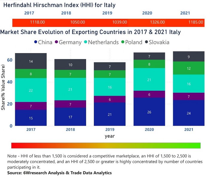 In the year 2021, China was the largest exporter in terms of value, followed by Netherlands. It has registered a growth of 21.46% over the previous year. While Netherlands registered a growth of 5.88% as compare to the previous year. In the year 2017 Netherlands was the largest exporter followed by China. In term of Herfindahl Index, which measures the competitiveness of countries exporting, Italy has the Herfindahl index of 1118 in 2017 which signifies high competitiveness also in 2021 it registered a Herfindahl index of 1185 which signifies high competitiveness in the market.
