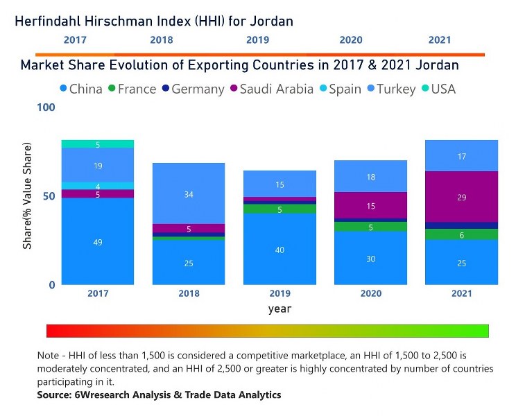 In the year 2021, Saudi Arabia was the largest exporter in terms of value, followed by China. It has registered a growth of 91.57% over the previous year. While China registered a decline of -17.43% as compare to the previous year. In the year 2017 China was the largest exporter followed by Turkey. In term of Herfindahl Index, which measures the competitiveness of countries exporting, Jordan has the Herfindahl index of 2866 in 2017 which signifies high concentration also in 2021 it registered a Herfindahl index of 1856 which signifies moderately concentrated in the market.