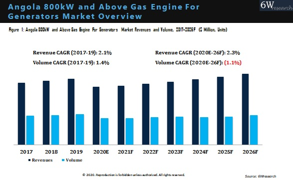 According to 6Wresearch, Angola 800kW and Above Gas Engine for Generators Market size is expected to grow at a CAGR of 2.3% during 2020-26. Increasing government investment in power generation and efforts to diversify the economy to meet the increasing energy demand for a growing population is among the Angolan government’s highest stated priorities. In order to achieve a targeted 9.9 GW of installed generation capacity and a 60 percent electrification rate by 2025, the government has instituted an ambitious infrastructure plans.