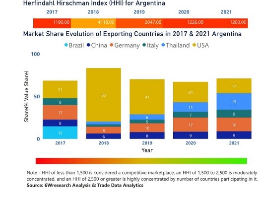 In the year 2021, Thailand was the largest exporter in terms of value, followed by the USA. It has registered a growth of 135.98% over the previous year. While the USA registered a growth of 1.31% as compared to the previous year. In the year 2017, the USA was the largest exporter followed by Germany. In terms of the Herfindahl Index, which measures the competitiveness of countries exporting, Argentina has a Herfindahl index of 1190 in 2017 which signifies high competitiveness also in 2021 it registered a Herfindahl index of 1203 which signifies high competitiveness in the market.