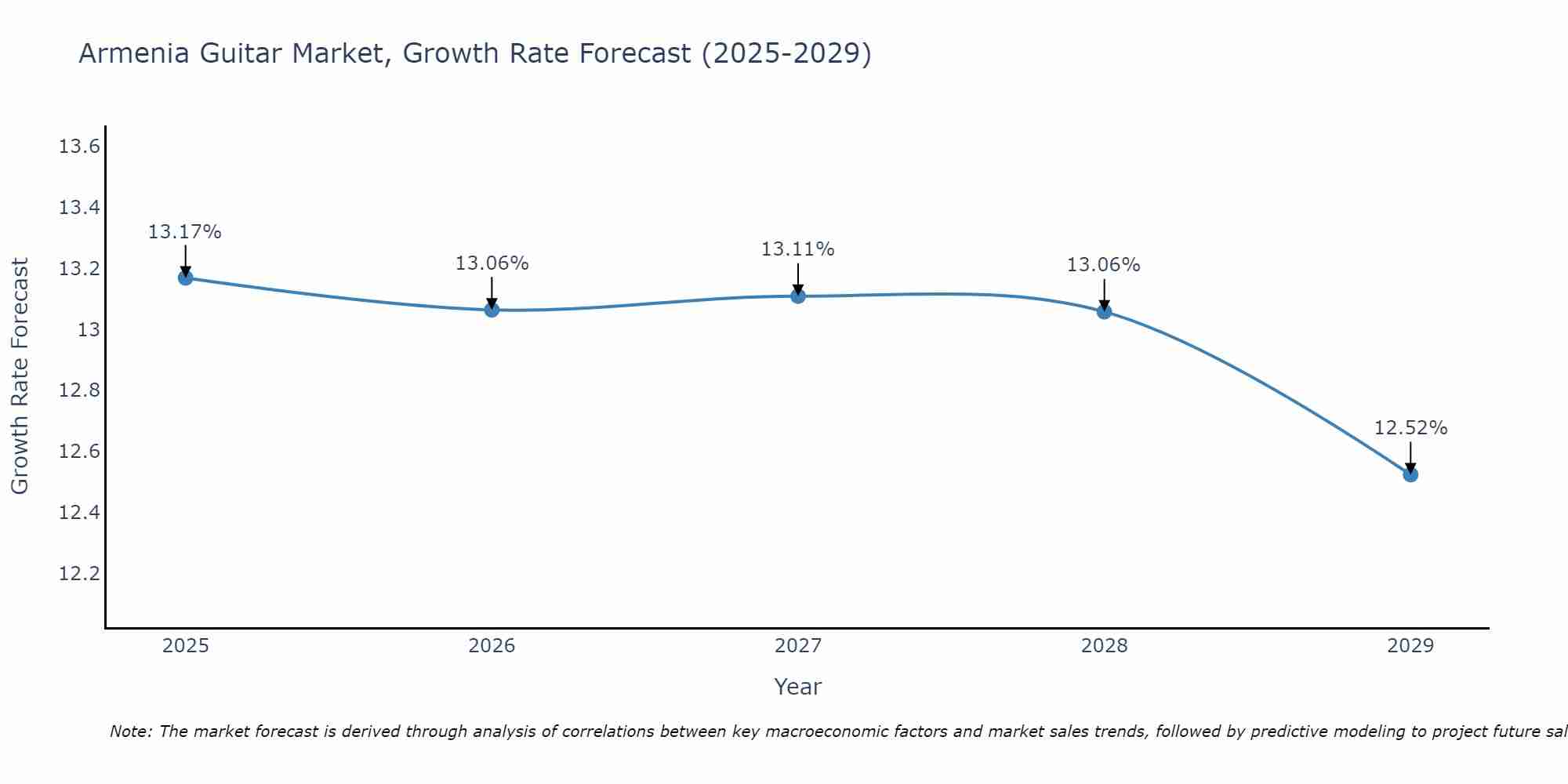 The Armenia Guitar Market is projected to witness mixed growth rate patterns during 2025 to 2029. Although the growth rate starts strong at 13.17% in 2025, it steadily loses momentum, ending at 12.52% by 2029.