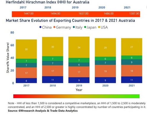In the year 2021, the USA was the largest exporter in terms of value, followed by Germany. It has registered a growth of 8.34% over the previous year. While Germany registered a growth of 9.13% as compare to the previous year. In the year 2017, the USA was the largest exporter followed by Germany. In terms of the Herfindahl Index, which measures the competitiveness of countries exporting, Australia has a Herfindahl index of 1447 in 2017 which signifies high competitiveness also in 2021 it registered a Herfindahl index of 1387 which signifies high competitiveness in the market.