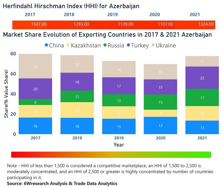 In the year 2021, Turkey was the largest exporter in terms of value, followed by Russia. It has registered a growth of 65.79% over the previous year. While Russia registered a growth of 28.42% as compare to the previous year. In the year 2017 Ukraine was the largest exporter followed by Turkey. In term of Herfindahl Index, which measures the competitiveness of countries exporting, Azerbaijan has the Herfindahl index of 1507 in 2017 which signifies moderately concentrated also in 2021 it registered a Herfindahl index of 1324 which signifies high competitiveness in the market.