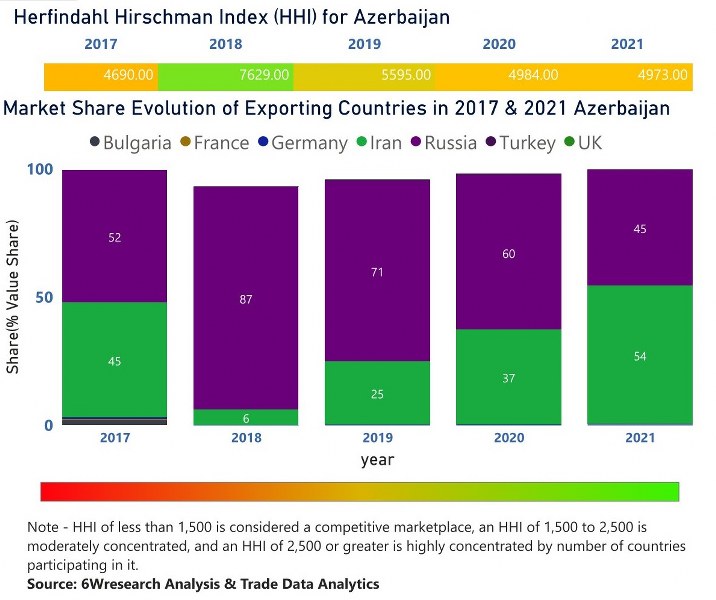 In the year 2021, Iran was the largest exporter in terms of value, followed by Russia. It has registered a growth of 165.39% over the previous year. While Russia registered a growth of 36.59% as compare to the previous year. In the year 2017 Russia was the largest exporter followed by Iran. In term of Herfindahl Index, which measures the competitiveness of countries exporting, Azerbaijan has the Herfindahl index of 4690 in 2017 which signifies high concentration also in 2021 it registered a Herfindahl index of 4973 which signifies high concentration in the market.