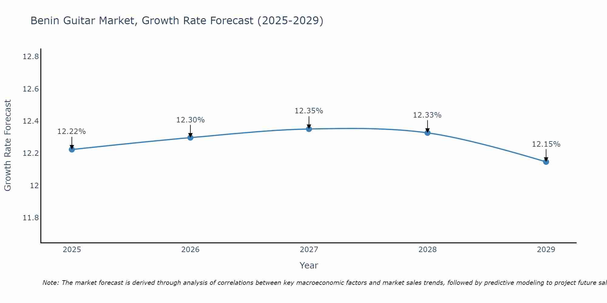 The Benin Guitar Market is projected to witness mixed growth rate patterns during 2025 to 2029. Growth accelerates to 12.35% in 2027, following an initial rate of 12.22%, before easing to 12.15% at the end of the period.