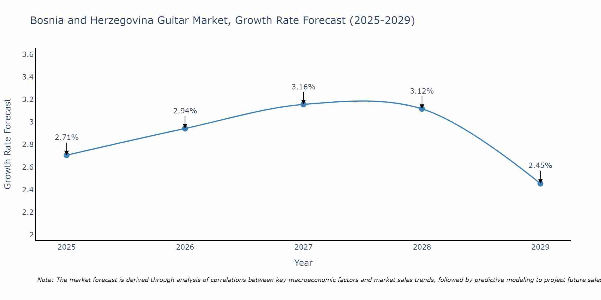 The Bosnia and Herzegovina Guitar Market is projected to witness mixed growth rate patterns during 2025 to 2029. Growth accelerates to 3.16% in 2027, following an initial rate of 2.71%, before easing to 2.45% at the end of the period.