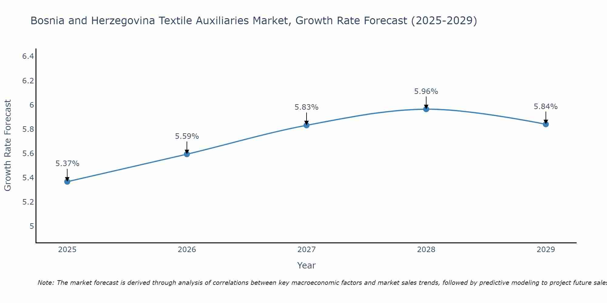 The Bosnia and Herzegovina Textile Auxiliaries Market is projected to witness mixed growth rate patterns during 2025 to 2029. Growth accelerates to 5.96% in 2028, following an initial rate of 5.37%, before easing to 5.84% at the end of the period.