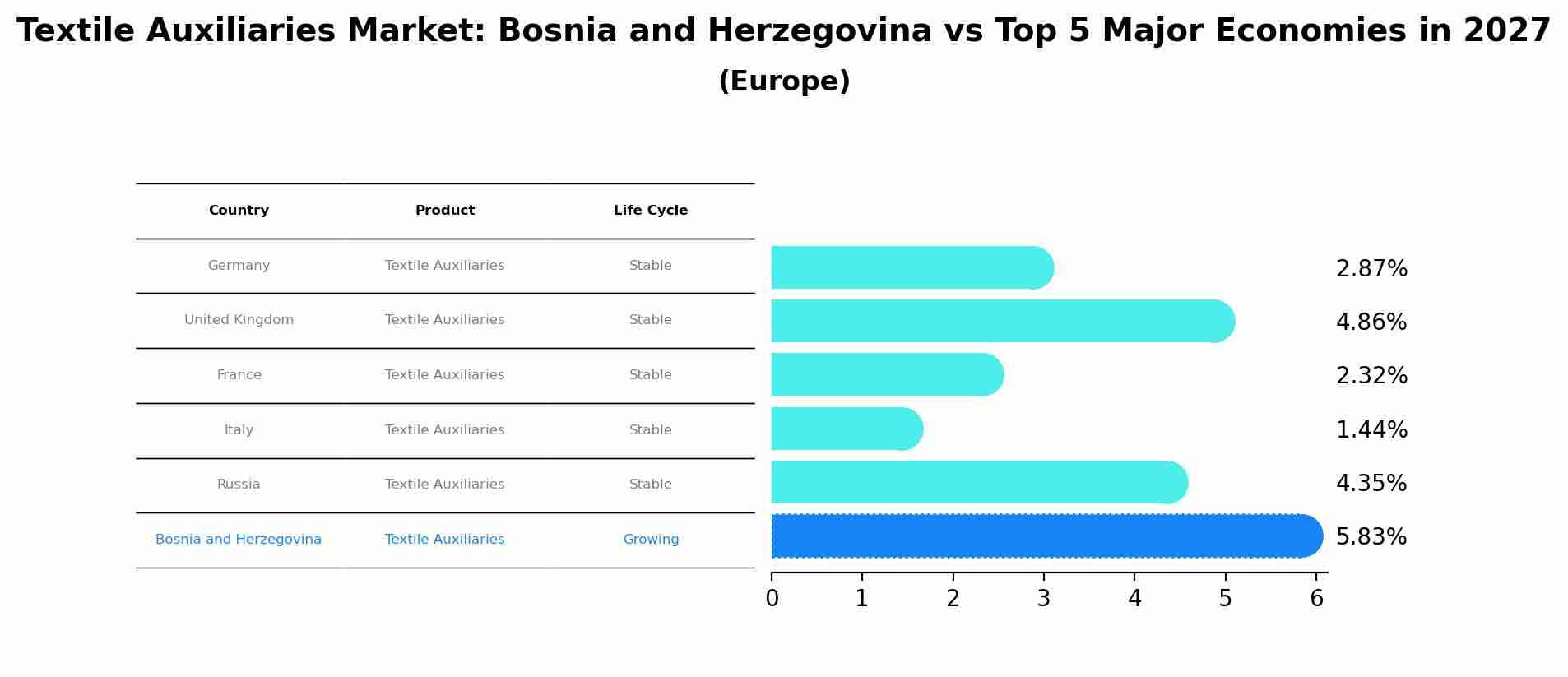 The Textile Auxiliaries market in Bosnia and Herzegovina is projected to grow at a growing growth rate of 5.83% by 2027, highlighting the country's increasing focus on advanced technologies within the Europe region, where Germany holds the dominant position, followed closely by United Kingdom, France, Italy and Russia, shaping overall regional demand.