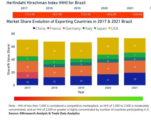 In the year 2021, the USA was the largest exporter in terms of value, followed by China. It has registered a growth of 27.67% over the previous year. While China registered a growth of 73.7% as compared to the previous year. In the year 2017, the USA was the largest exporter followed by Germany. In terms of Herfindahl Index, which measures the competitiveness of countries exporting, Brazil has a Herfindahl index of 1312 in 2017 which signifies high competitiveness also in 2021 it registered a Herfindahl index of 1364 which signifies high competitiveness in the market.