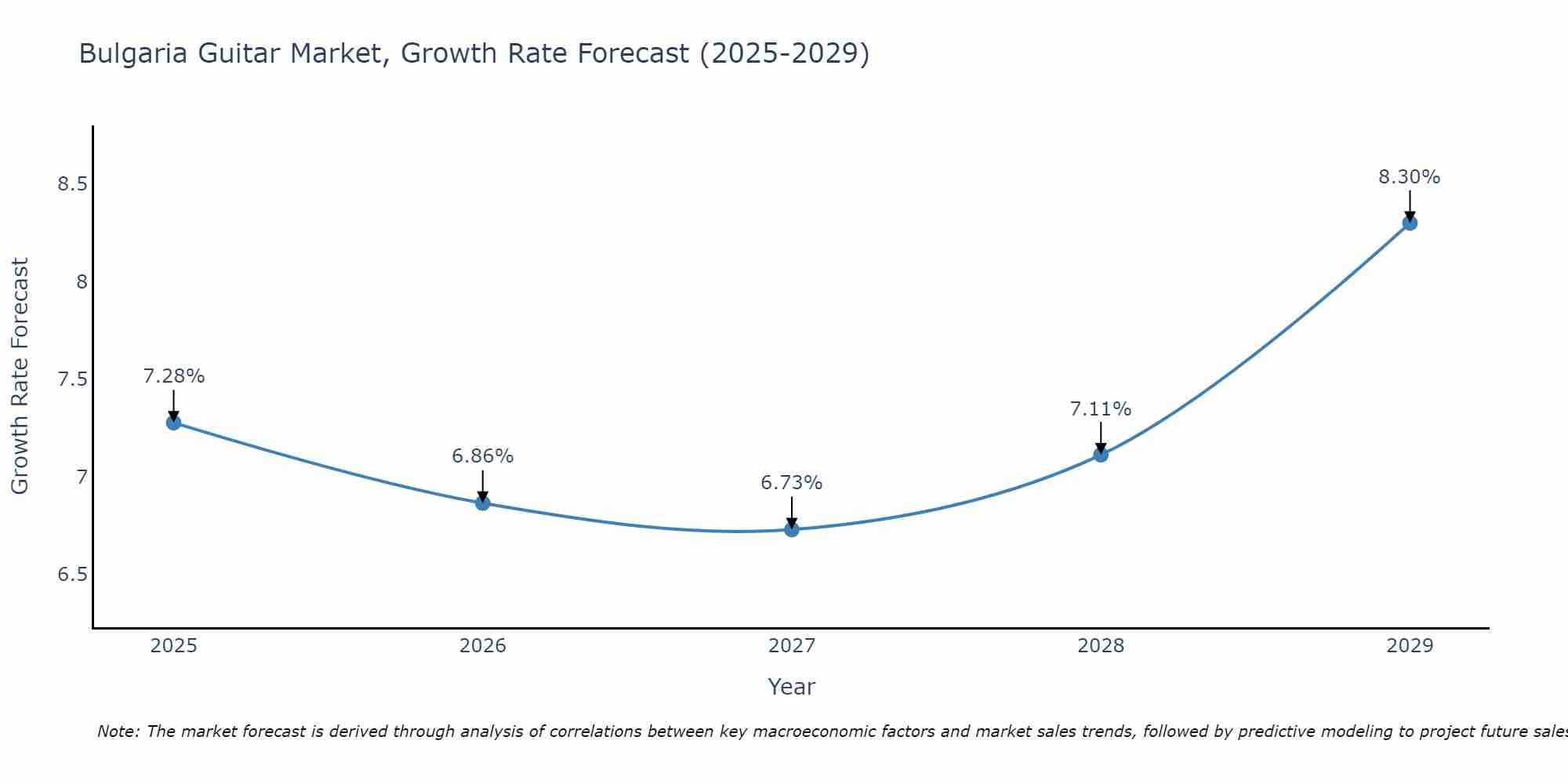 The Bulgaria Guitar Market is projected to witness mixed growth rate patterns during 2025 to 2029. From 7.28% in 2025, the growth rate steadily ascends to 8.30% in 2029.