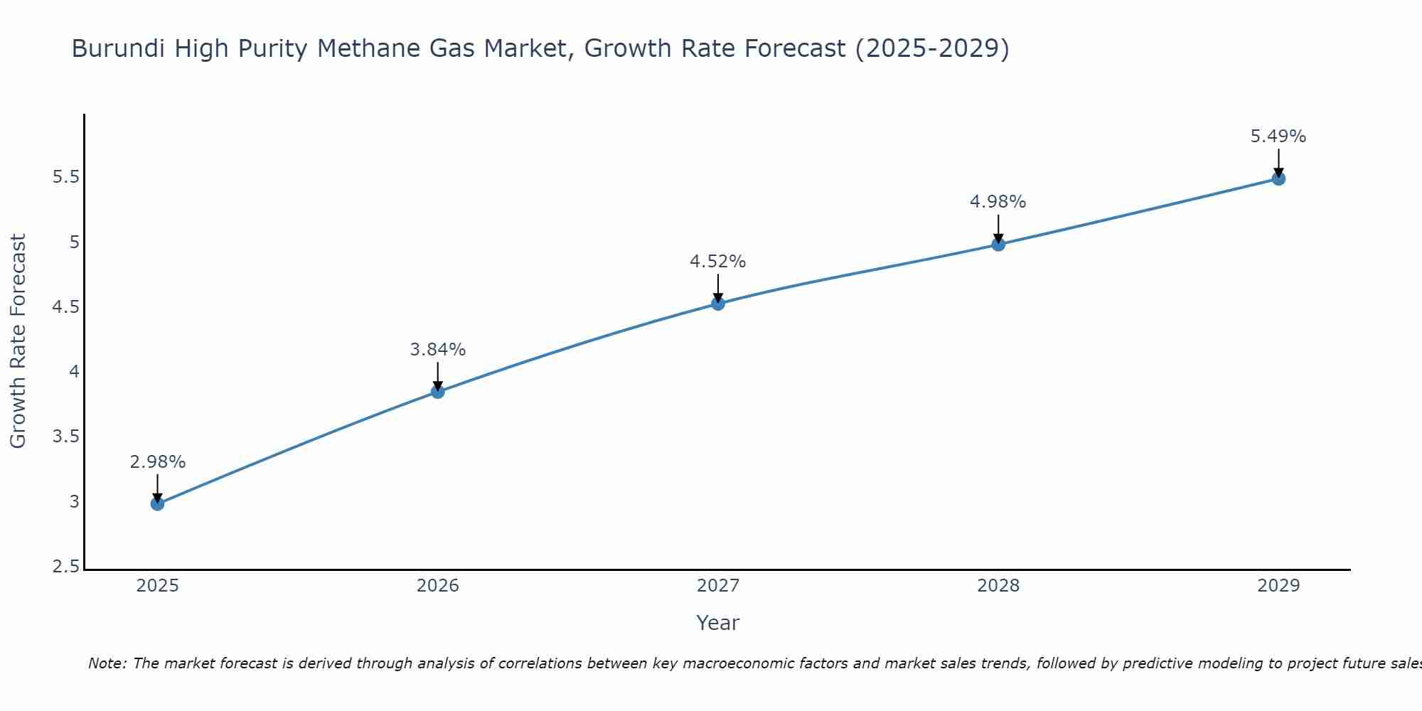 The Burundi High Purity Methane Gas Market is poised for steady growth rate improvements from 2025 to 2029. From 2.98% in 2025, the growth rate steadily ascends to 5.49% in 2029.