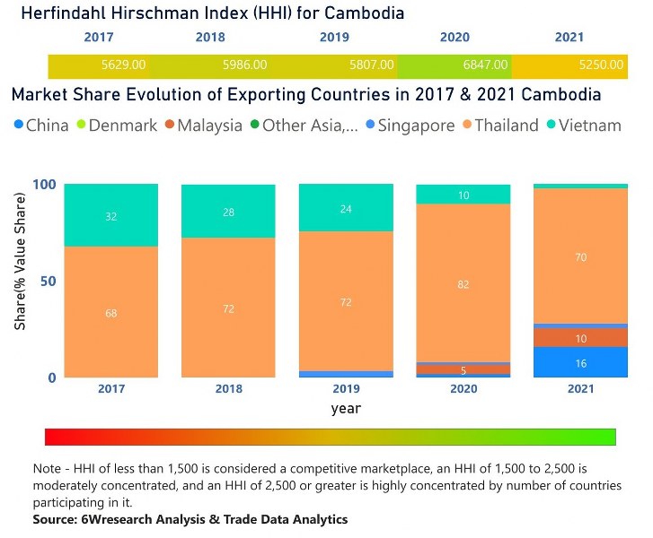 In the year 2021, Thailand was the largest exporter in terms of value, followed by China. It has registered a growth of 61.15% over the previous year. While China registered a growth of 1730.97% as compare to the previous year. In the year 2017 Thailand was the largest exporter followed by Viet Nam. In term of Herfindahl Index, which measures the competitiveness of countries exporting, Cambodia has the Herfindahl index of 5629 in 2017 which signifies high concentration also in 2021 it registered a Herfindahl index of 5250 which signifies high concentration in the market.