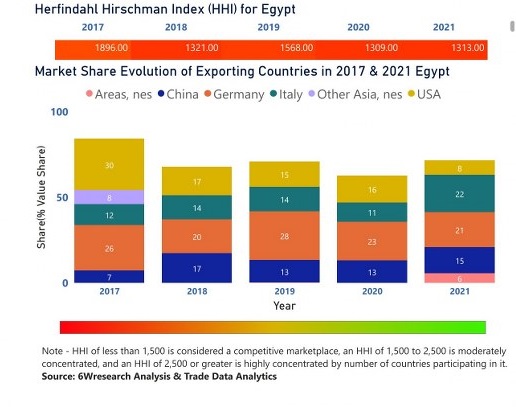 In the year 2021, Italy was the largest exporter in terms of value, followed by Germany. It has registered a growth of 89.3% over the previous year. While Germany registered a decline of -10.39% as compare to the previous year. In the year 2017 USA was the largest exporter followed by Germany. In term of Herfindahl Index, which measures the competitiveness of countries exporting, Egypt has the Herfindahl index of 1896 in 2017 which signifies moderately concentrated also in 2021 it registered a Herfindahl index of 1313 which signifies high competitiveness in the market.