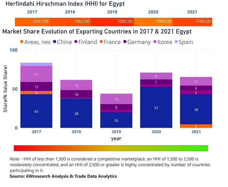 In the year 2021, China was the largest exporter in terms of value, followed by Rep. of Korea. It has registered a decline of -15.68% over the previous year. While Rep. of Korea registered a growth of 42.99% as compared to the previous year. In the year 2017, China was the largest exporter followed by Rep. of Korea. In terms of the Herfindahl Index, which measures the competitiveness of countries exporting, Egypt has a Herfindahl index of 2501 in 2017 which signifies high concentration also in 2021 it registered a Herfindahl index of 1765 which signifies moderately concentrated in the market.