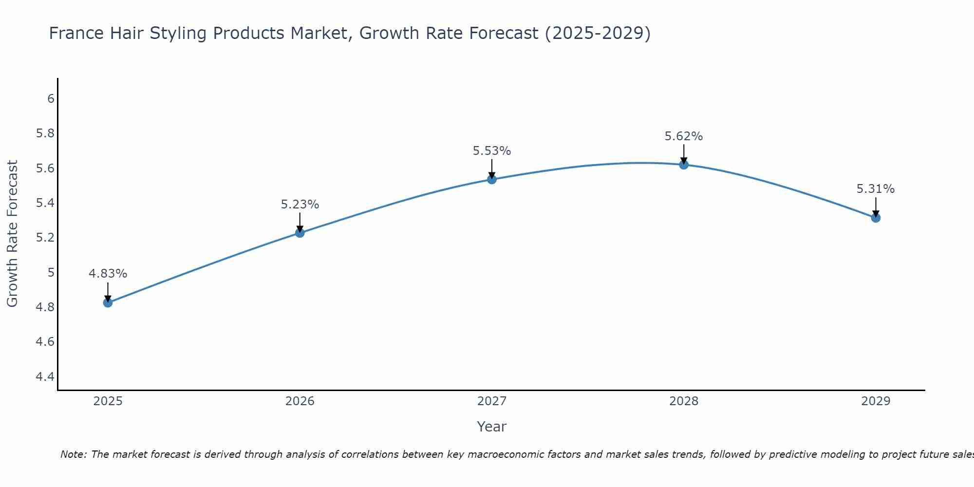 The France Hair Styling Products Market is projected to witness mixed growth rate patterns during 2025 to 2029. Starting at 4.83% in 2025, the market peaks at 5.62% in 2028, and settles at 5.31% by 2029.