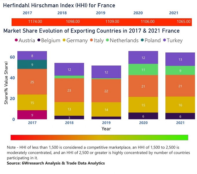 In the year 2021, Italy was the largest exporter in terms of value, followed by Germany. It has registered a growth of 26.77% over the previous year. While Germany registered a growth of 33.12% as compare to the previous year. In the year 2017 Italy was the largest exporter followed by Germany. In term of Herfindahl Index, which measures the competitiveness of countries exporting, France has the Herfindahl index of 1174 in 2017 which signifies high competitiveness also in 2021 it registered a Herfindahl index of 1065 which signifies high competitiveness in the market.