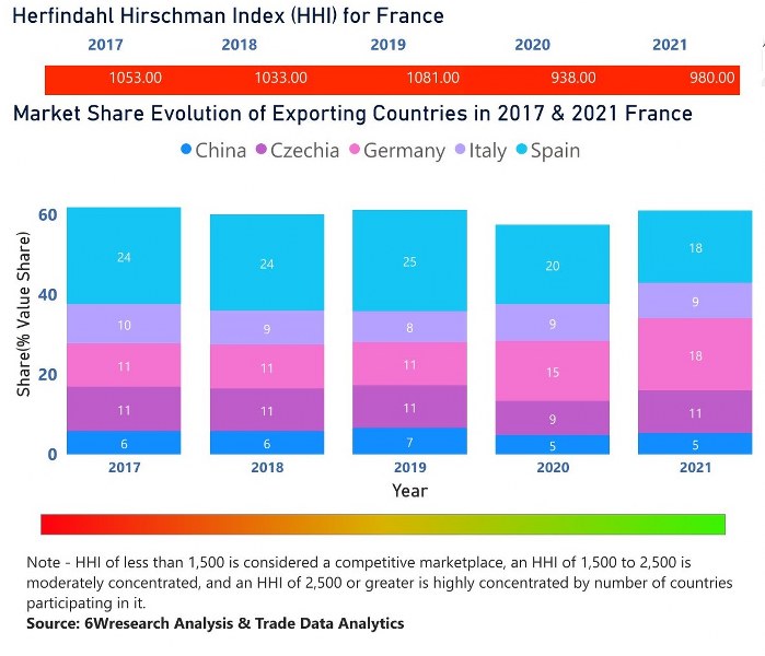 In the year 2021, Germany was the largest exporter in terms of value, followed by Spain. It has registered a growth of 49.53% over the previous year. While Spain registered a growth of 11.89% as compare to the previous year. In the year 2017 Spain was the largest exporter followed by Czechia. In term of Herfindahl Index, which measures the competitiveness of countries exporting, France has the Herfindahl index of 1053 in 2017 which signifies high competitiveness also in 2021 it registered a Herfindahl index of 980 which signifies high competitiveness in the market.