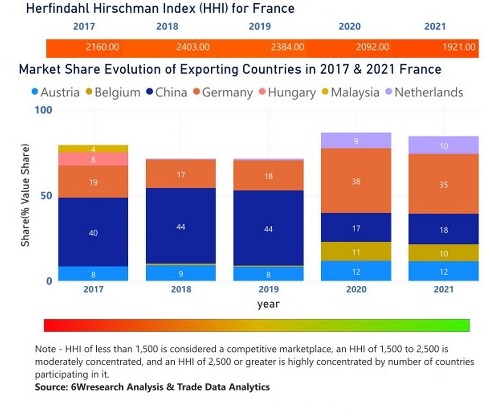 In the year 2021, Germany was the largest exporter in terms of value, followed by China. It has registered a growth of 25.63% over the previous year. While China registered a growth of 43.97% as compare to the previous year. In the year 2017 China was the largest exporter followed by Germany. In term of Herfindahl Index, which measures the competitiveness of countries exporting, France has the Herfindahl index of 2160 in 2017 which signifies moderately concentrated also in 2021 it registered a Herfindahl index of 1921 which signifies moderately concentrated in the market.