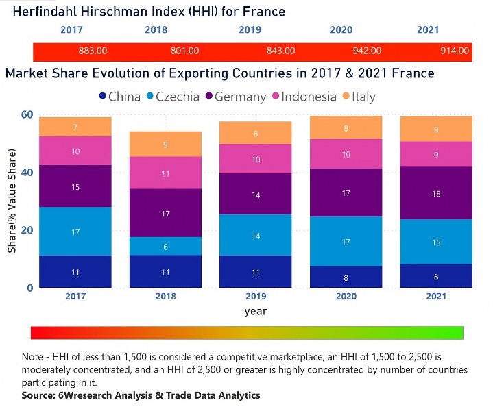 In the year 2021, Germany was the largest exporter in terms of value, followed by Czechia. It has registered a growth of 31.72% over the previous year. While Czechia registered a growth of 8.56% as compare to the previous year. In the year 2017 Czechia was the largest exporter followed by Germany. In term of Herfindahl Index, which measures the competitiveness of countries exporting, France has the Herfindahl index of 883 in 2017 which signifies high competitiveness also in 2021 it registered a Herfindahl index of 914 which signifies high competitiveness in the market.