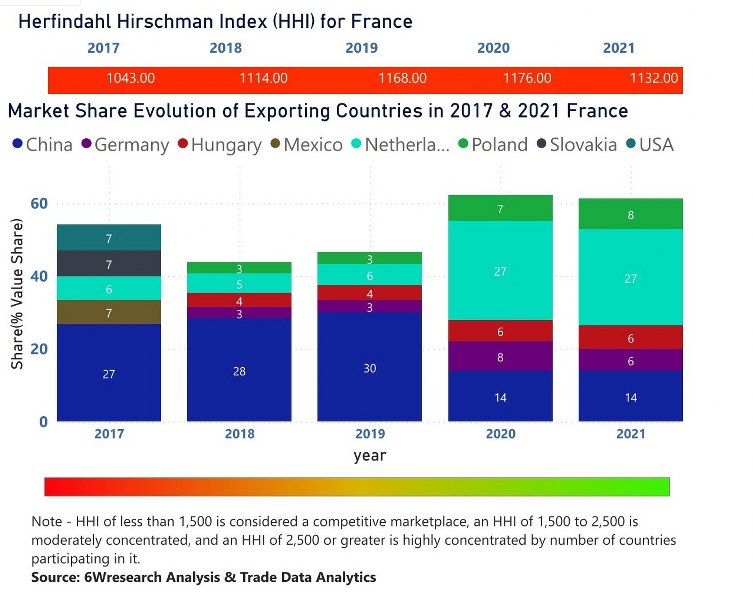 In the year 2021, Netherlands was the largest exporter in terms of value, followed by China. It has registered a growth of 21.83% over the previous year. While China registered a growth of 25.33% as compare to the previous year. In the year 2017 China was the largest exporter followed by USA. In term of Herfindahl Index, which measures the competitiveness of countries exporting, France has the Herfindahl index of 1043 in 2017 which signifies high competitiveness also in 2021 it registered a Herfindahl index of 1132 which signifies high competitiveness in the market.