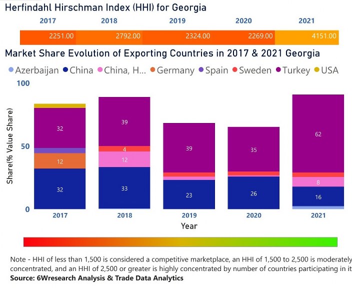 In the year 2021, Turkey was the largest exporter in terms of value, followed by China. It has registered a growth of 54.31% over the previous year. While China registered a decline of -46.81% as compare to the previous year. In the year 2017 China was the largest exporter followed by Turkey. In term of Herfindahl Index, which measures the competitiveness of countries exporting, Georgia has the Herfindahl index of 2251 in 2017 which signifies moderately concentrated also in 2021 it registered a Herfindahl index of 4151 which signifies high concentration in the market.