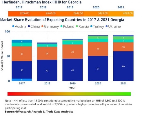 In the year 2021, China was the largest exporter in terms of value, followed by Germany. It has registered a growth of 65.87% over the previous year. While Germany registered a decline of -10.59% as compare to the previous year. In the year 2017 China was the largest exporter followed by Germany. In term of Herfindahl Index, which measures the competitiveness of countries exporting, Georgia has the Herfindahl index of 2286 in 2017 which signifies moderately concentrated also in 2021 it registered a Herfindahl index of 4028 which signifies high concentration in the market.