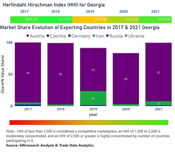 In the year 2021, Russia was the largest exporter in terms of value, followed by Iran. It has registered a growth of 4.12% over the previous year. While Iran registered a growth of 99.64% as compare to the previous year. In the year 2017 Russia was the largest exporter followed by Iran. In term of Herfindahl Index, which measures the competitiveness of countries exporting, Georgia has the Herfindahl index of 8846 in 2017 which signifies high concentration also in 2021 it registered a Herfindahl index of 8434 which signifies high concentration in the market.